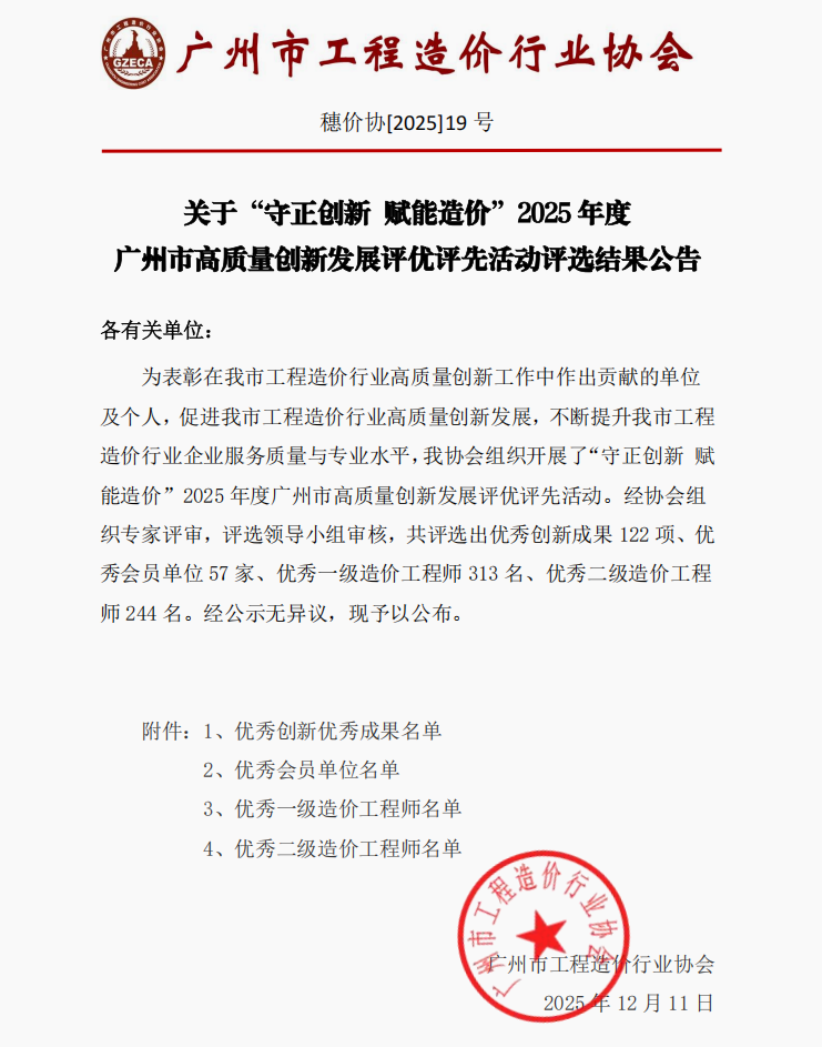 转:关于“守正创新 赋能造价”2025年度广州市高质量创新发展评优评先活动评选结果公告(穗价协[2025]19号)